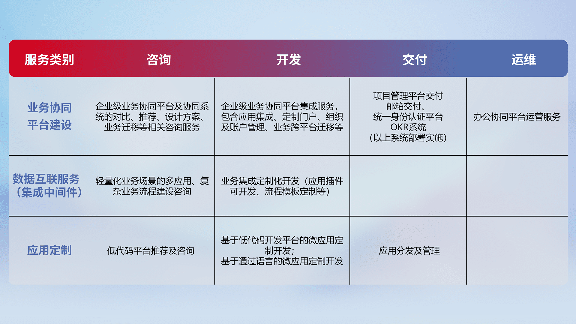 针对钉钉、、、企微、、、、IDaas等平台级产品提供产品的规划、、、、方案、、、、交付、、、定制化开发等服务,,,实现如统一协同办公、、智能客户服务、、、、混合会议管理、、、智能数据查询、、、、等业务场景,,,,实现数字化转型。。。。